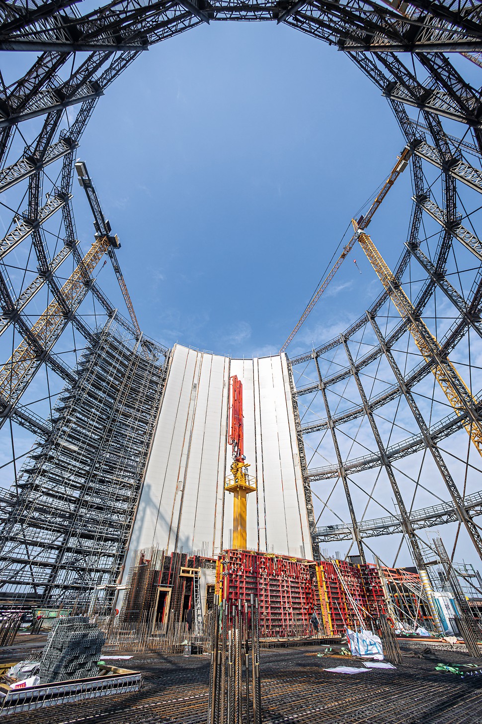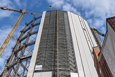 Der schlüsselfertige Umbau wird vom Bauunternehmen WOLFF & MÜLLER realisiert, wie bereits zahlreiche andere Gebäude auf dem EUREF-Campus. Als Teil des eingespielten Teams wurden auch beim Gasometer wieder die Ingenieure der PERI Niederlassung Berlin einbezogen, die sich um die Herausforderungen rund um Schalung und Gerüst kümmerten. Denn der Rohbau des Hochhauses und die Instandsetzung der umgebenden historischen Stahlkonstruktion sollten parallel ausgeführt werden. Auf engstem Raum und weitestgehend ohne Beeinträchtigung des Umfelds.