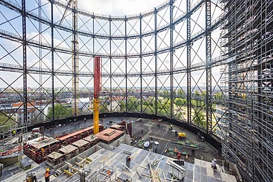 Bereits nach einer kurzen Planungszeit von drei Monaten begannen im August 2021 die Rohbauarbeiten. Gleichzeitig startete das Bauteam die Sanierung des historischen Stahlgerüsts. Gerade einmal 1,50 m betrug der Abstand zwischen der Rohbaukante und der umgebenden Stahlkonstruktion – doch die Experten von PERI fanden eine ebenso funktionelle wie elegante Lösung. Mit dem PERI UP Gerüstbaukasten konstruierten sie eine Gerüstlösung, die sich über die gesamte Höhe eng an die Form der runden Stahlkonstruktion anschmiegte. Zum Schutz der Umgebung innen und außen vollständig eingehaust, wanderte das Gerüst während der Sanierungsphase im Uhrzeigersinn abschnittsweise rund um den Gasometer. Stahlsegment um Stahlsegment konnte dadurch mithilfe der Sandstrahltechnik entschichtet und mit einem neuen Korrosionsschutz versehen werden, während gleichzeitig die Rohbauarbeiten stattfanden. So wurde das Umfeld bis zum Abschluss der Sanierung weitestgehend vor übermäßigem Baulärm und Schmutz verschont.