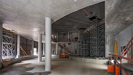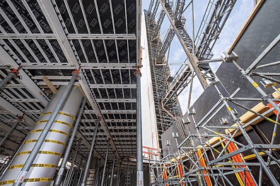 Nahezu unmerklich, da innerhalb des unteren Stahlrings und teils hinter dem PERI UP Arbeits- und Schutzgerüst, wuchs parallel der Neubau Stockwerk für Stockwerk in die Höhe. Alle zwei Wochen wurde ein komplettes Regelgeschoss fertiggestellt. Mit dem Wandschalungssystem MAXIMO und der Deckenschalung SKYDECK ließen sich auch die zahlreichen Sichtbetonflächen an Wänden und Decken schnell und professionell realisieren. Um den Mehrbedarf an Schalungselementen abzudecken, nutzte das Bauunternehmen die Möglichkeit, PERI Kauf- und Mietelemente miteinander zu kombinieren. Im Schutz der umgebenden RCS Kletterschutzwand konnte so in jeder Höhe am Rohbau witterungsgeschützt, sicher und zügig gearbeitet werden. Dabei halfen die einseitige Ankertechnik der MAXIMO Wandschalung und das leicht zu handhabende SKYDECK Deckenschalungssystem, problemlos im Zeitplan zu bleiben.