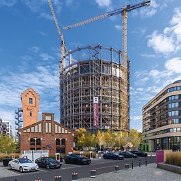 Als letztes Gebäude wird der Gasometer instandgesetzt. Zwischenzeitlich diente die 78 m hohe Stahlkonstruktion des Industriedenkmals als imposante Location für die Talkshows von TV-Moderator Günther Jauch. Jetzt folgt der Ausbau zu einem Büro- und Konferenzzentrum. Das graue Stahlgerüst fungiert, mit einem Respektabstand von einem Meter, als Rahmen für den runden Neubau im Inneren. So bleibt das historische Denkmal erhalten und wird gleichzeitig mit neuem Leben gefüllt. Die Neugestaltung erinnert dabei an den ehemals auf- und abfahrenden Teleskopbehälter innerhalb des Stahlskeletts. Auf 15 Stockwerken entstehen rund 28.000 m2 Bürofläche, mit einer Sky-Lounge und öffentlich zugänglicher Dachterrasse in 66 m Höhe als Abschluss. Große Glasflächen in der Fassade sorgen für viel Transparenz und Tageslicht im Gebäude. Künftig werden etwa 2.000 Beschäftigte der Deutschen Bahn von hier aus die Digitalisierung der Schiene vorantreiben.