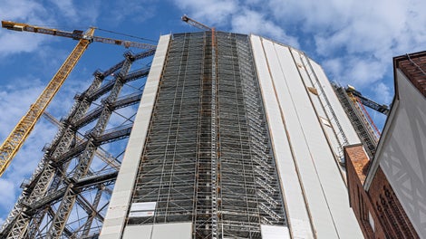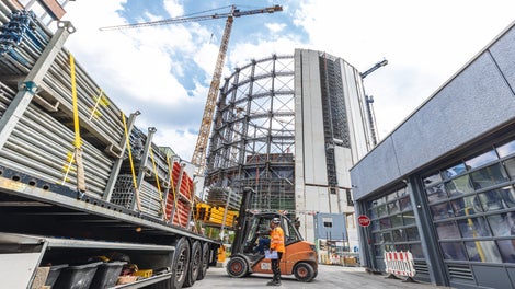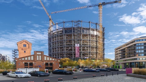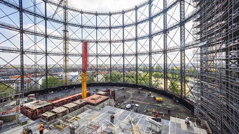 Der Gasometer auf dem EUREF-Campus in Berlin-Schöneberg wird mit Unterstützung von PERI instandgesetzt.