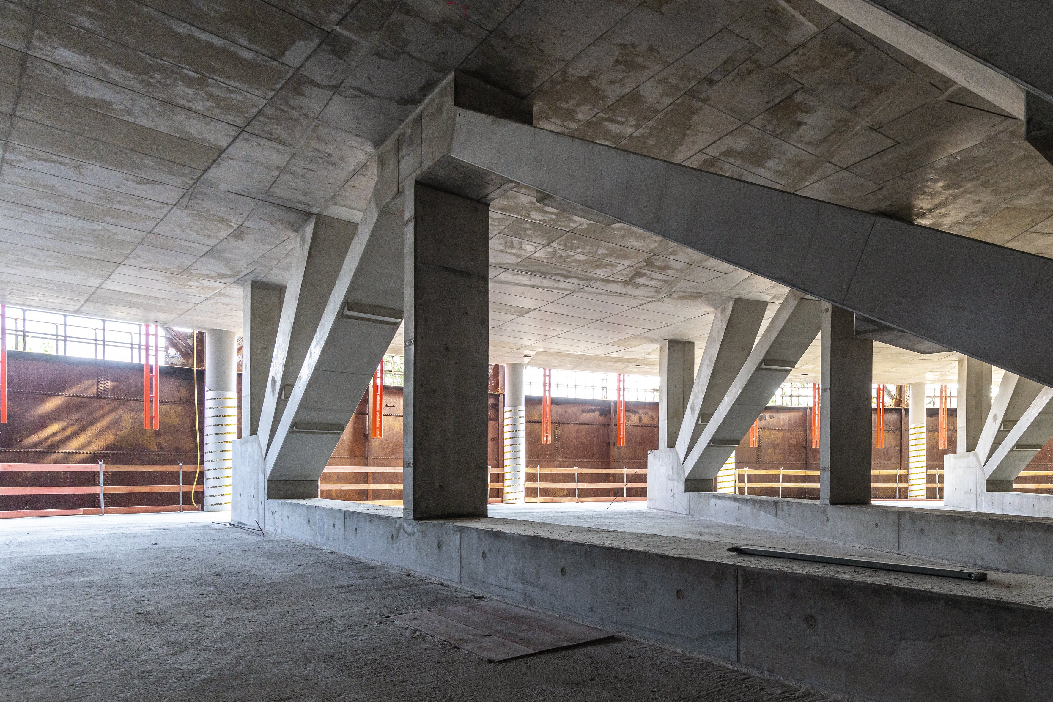- Für die Umwidmung zum Büro- und Konferenzzentrum wird das denkmalgeschützte Bauwerk innerhalb seines Stahlgerüsts entkernt und neu errichtet.