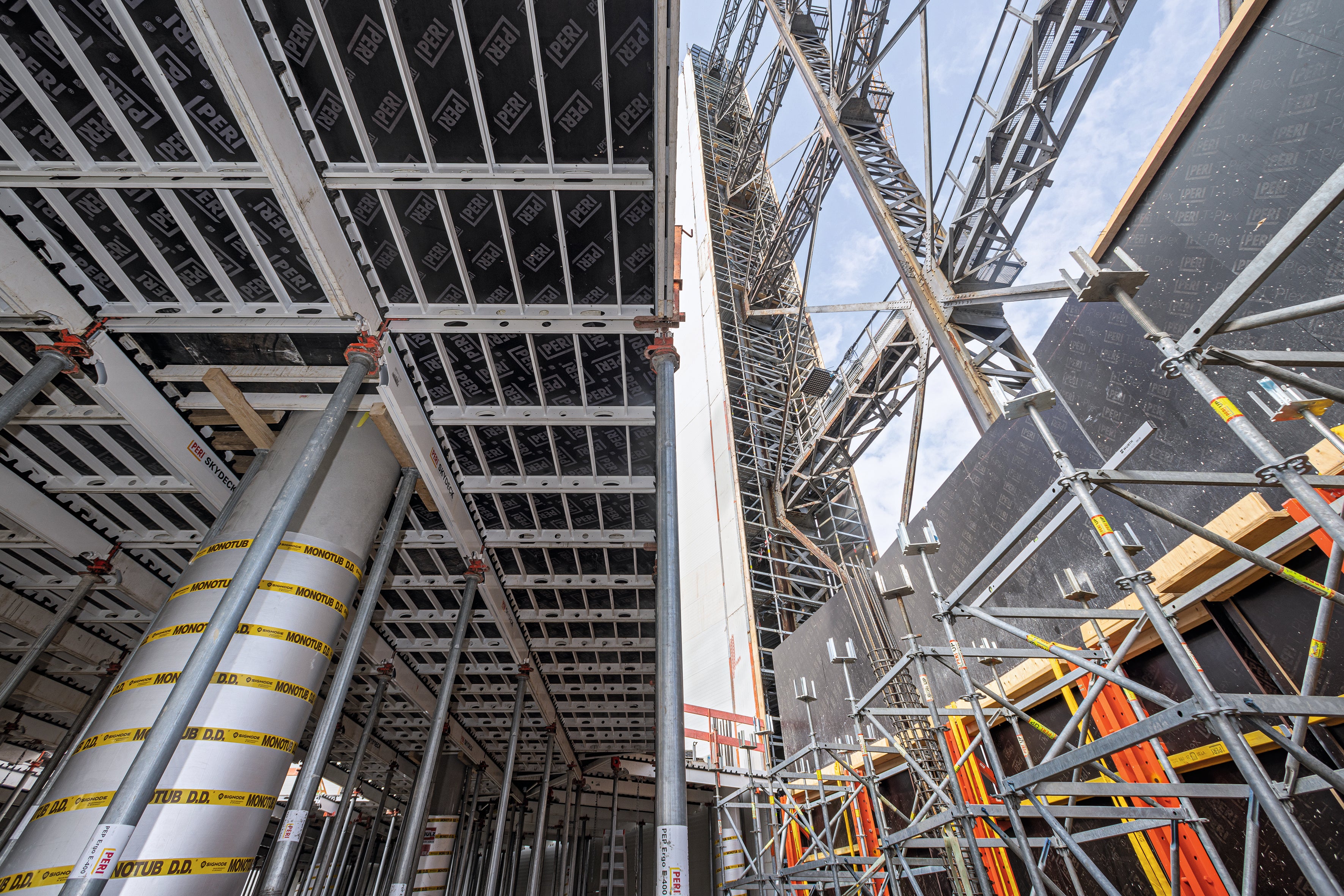 Die PERI UP Gerüstlösung und die RCS Kletterschutzwand wurden aus einer Hand geplant und konnten daher optimal aufeinander abgestimmt werden.
