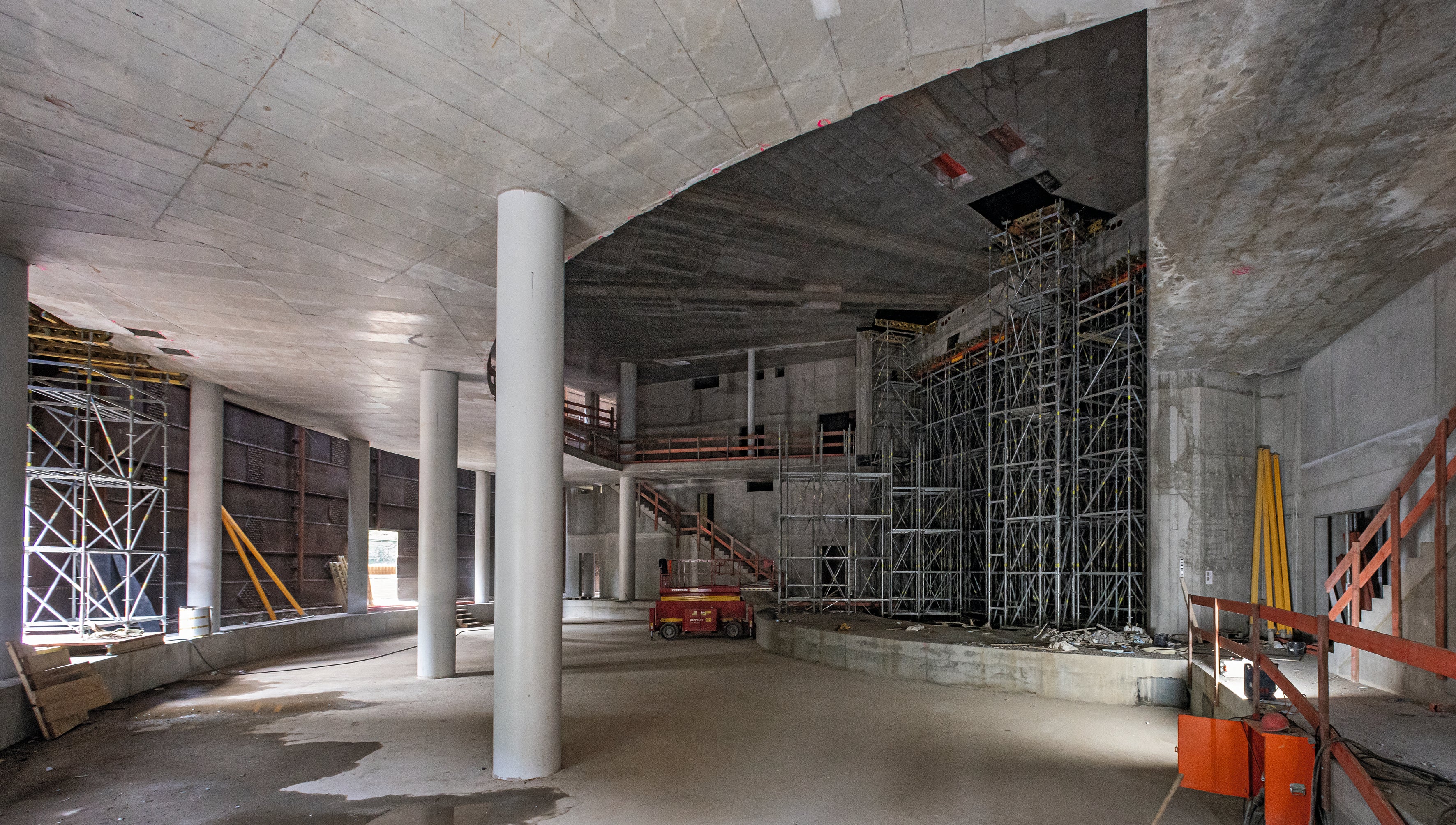 - Das graue Stahlgerüst fungiert, mit einem Respektabstand von einem Meter, als Rahmen für den runden Neubau im Inneren. So bleibt das historische Denkmal erhalten und wird gleichzeitig mit neuem Leben gefüllt.