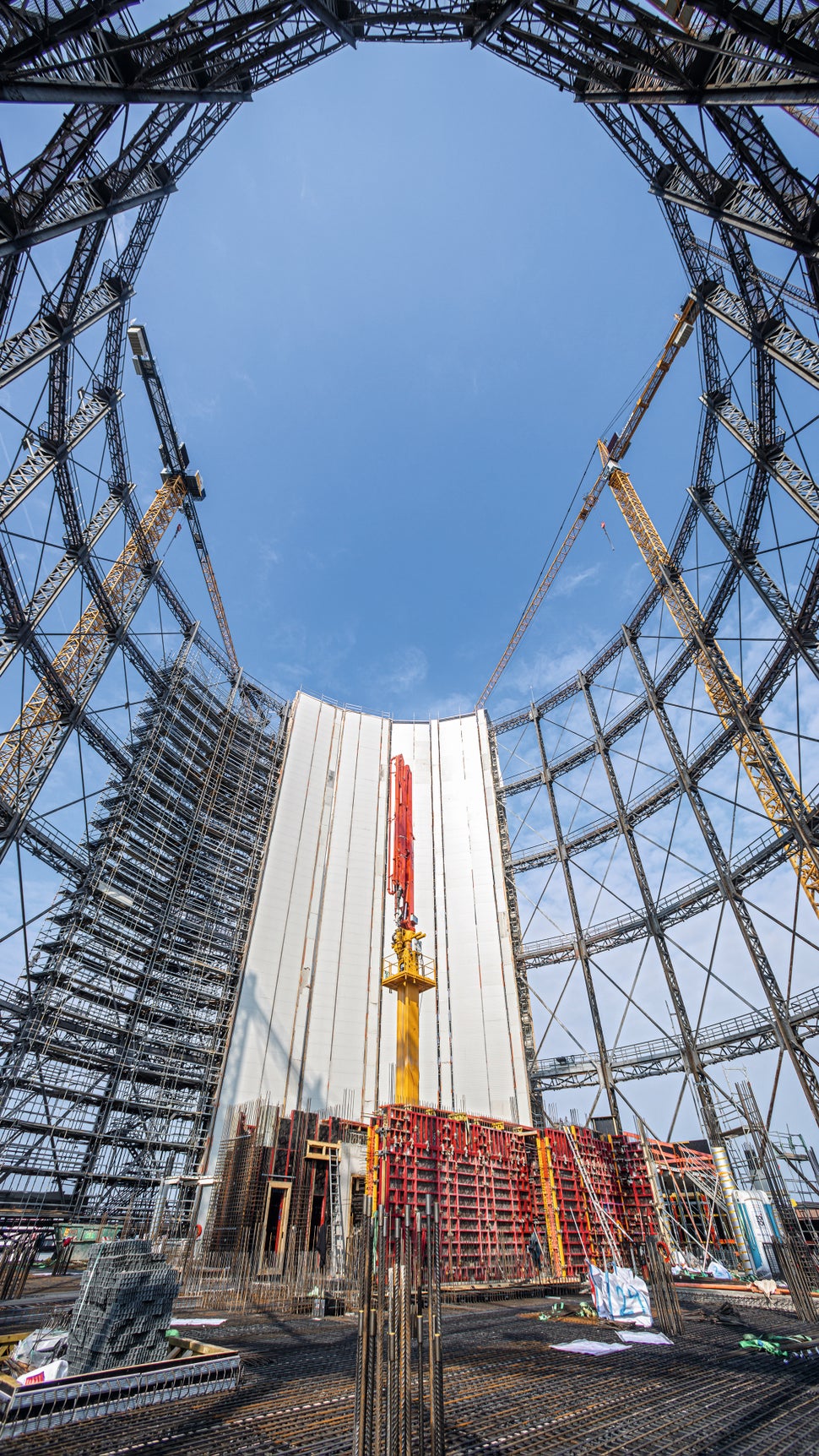 Im Inneren des Stahlgerüsts entstand ein runder Neubau mit 15 Geschossen.