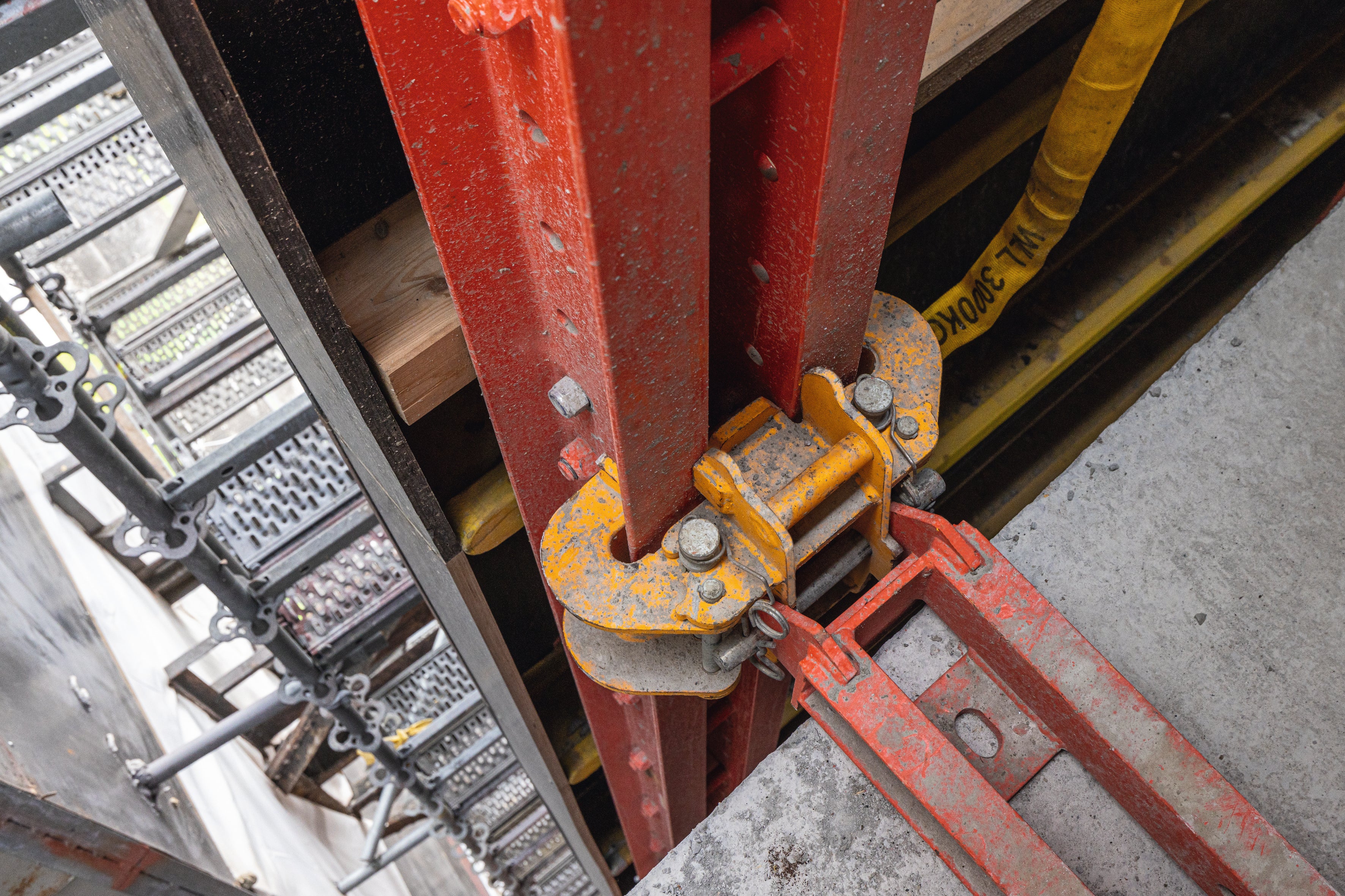Die zwischen Rohbaukante und eingerüsteter Stahlkonstruktion angeordnete RCS Kletterschutzwand ist über die Kletterschuhe stets mit dem Bauwerk verbunden.