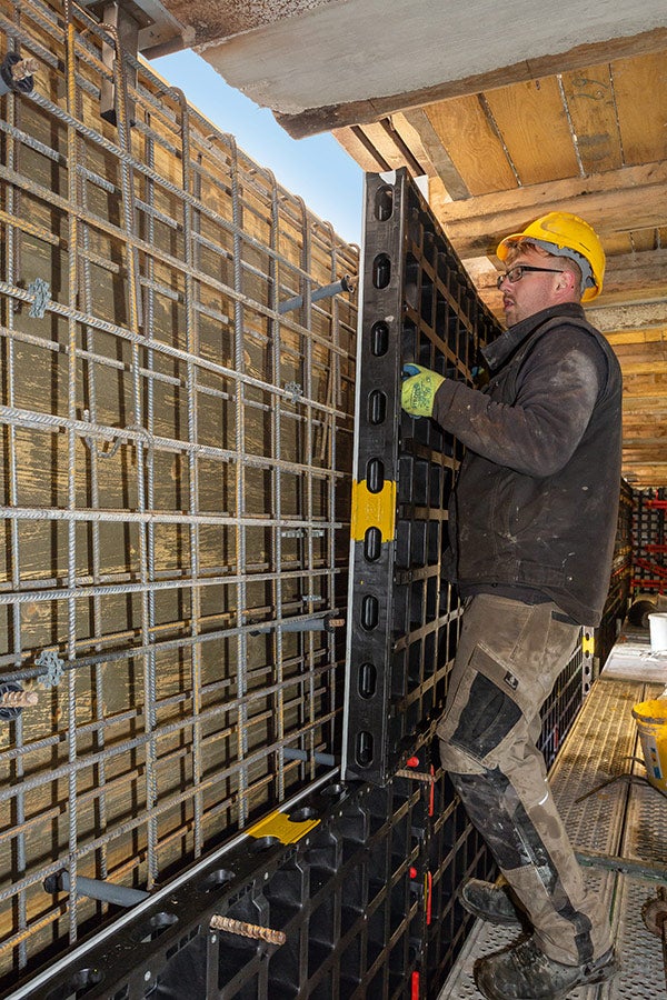Für die Herstellung der über 3 m hohen Stahlbetonaußenwand wurde die DUO als leichte Innenschalung in Kombination mit der TRIO Struktur als Außenschalung eingesetzt.